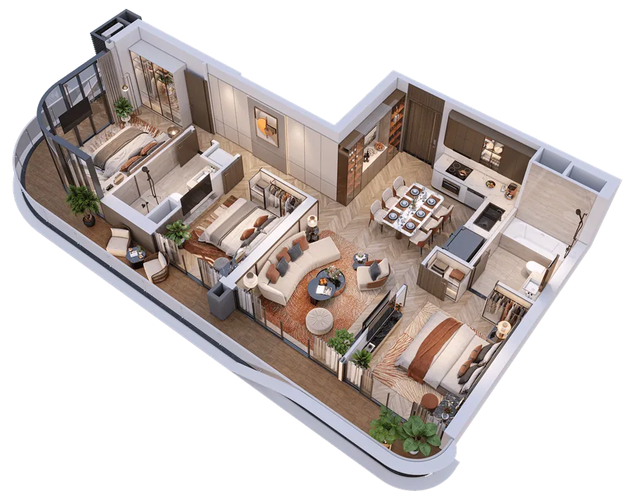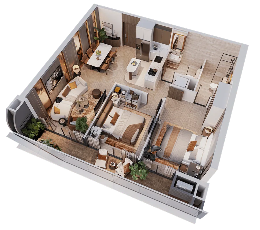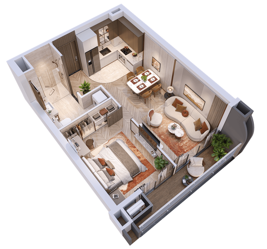 - Balcony Extension (5m²): Kính cong tràn viền, ghế lounge mini – mở rộng không gian thị giác lên 30% nhờ hiệu ứng vô cực.